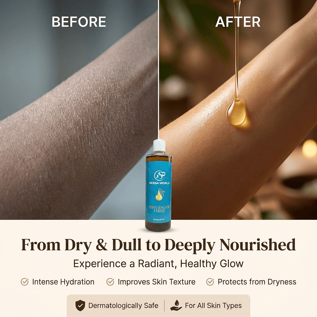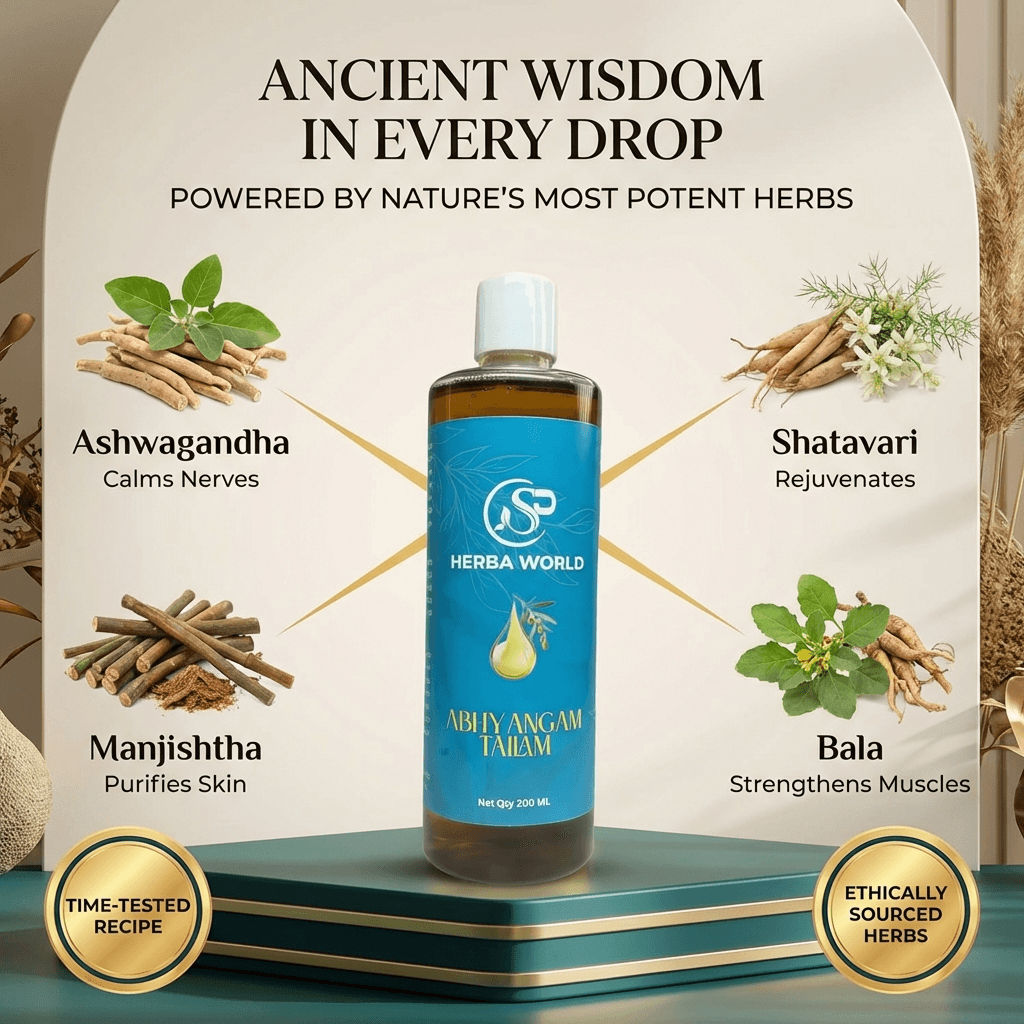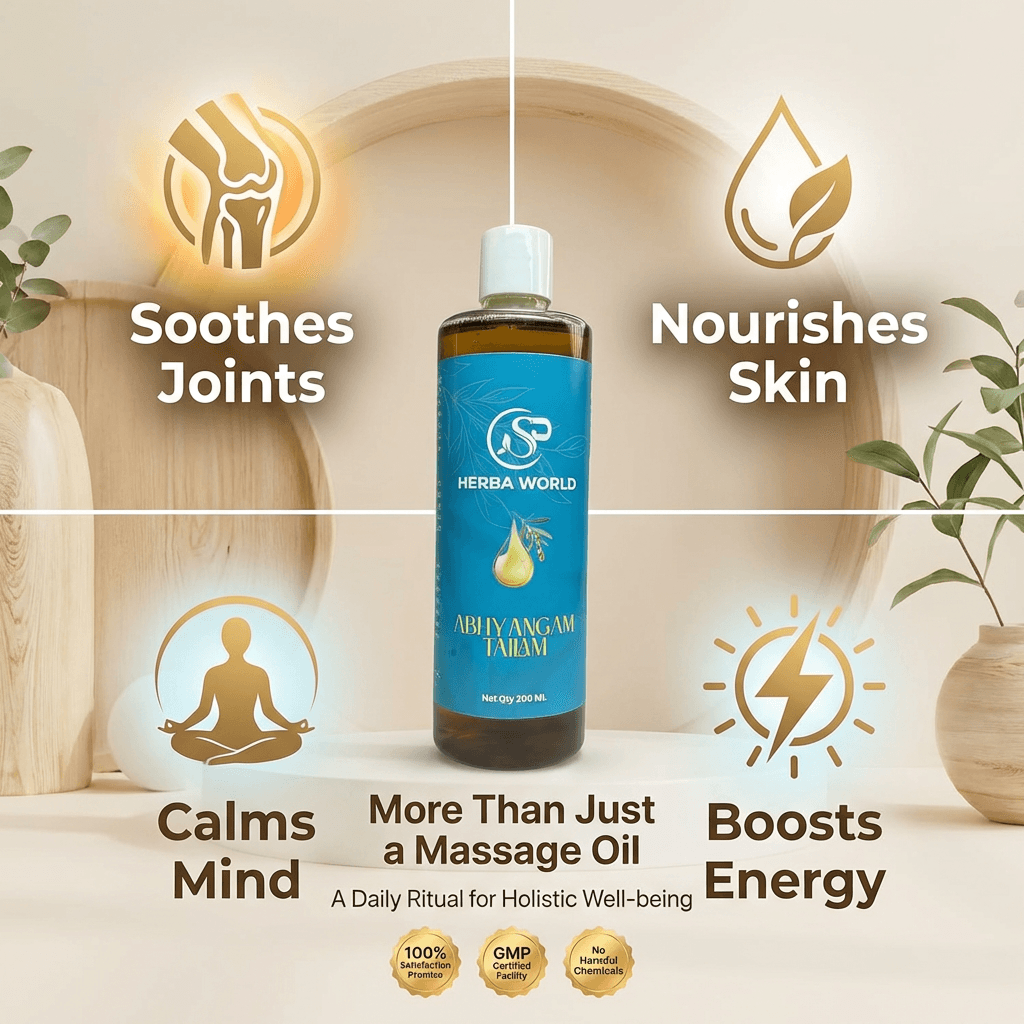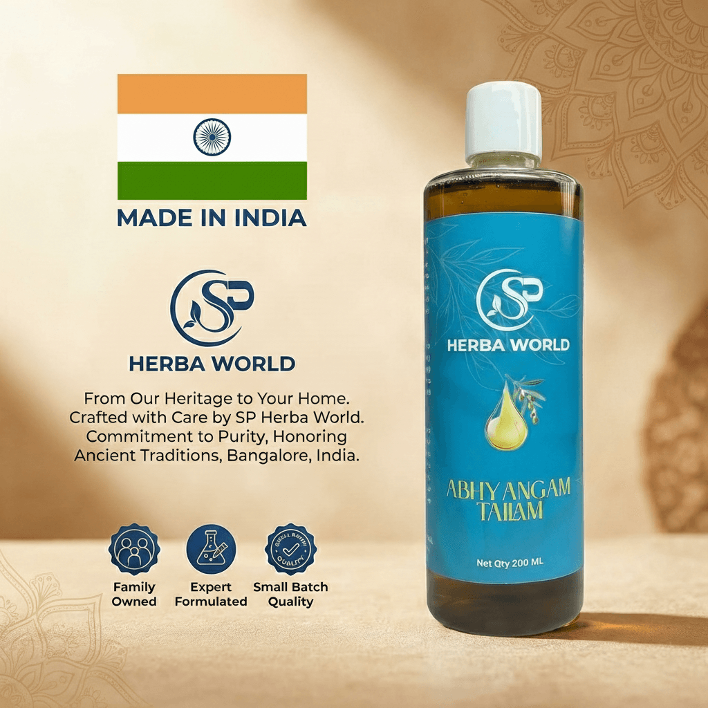 SP Herba World Abhyangam Tailam is a premium herbal body oil crafted to support your daily self-care ritual. Inspired by traditional massage practices, this nourishing oil is blended in a high-quality sesame oil base to provide smooth application and deep conditioning.