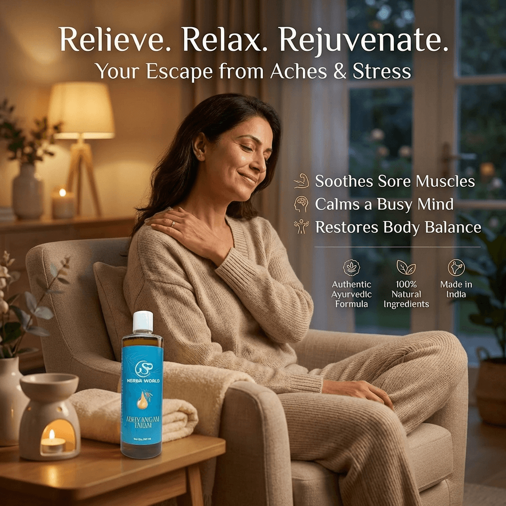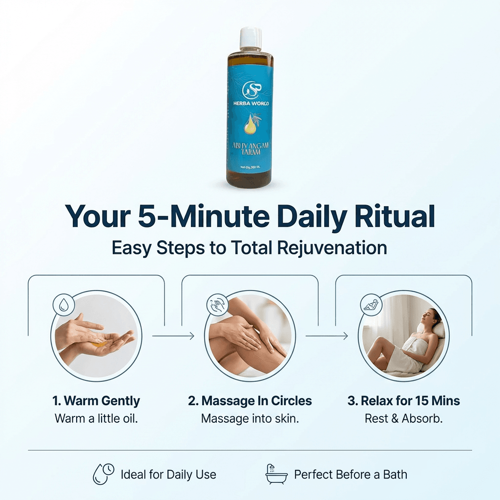 Warm a small quantity of SP Herba World Abhyangam Tailam and gently massage onto the body using circular or upward strokes. Leave on for 20–30 minutes before bath for best results.