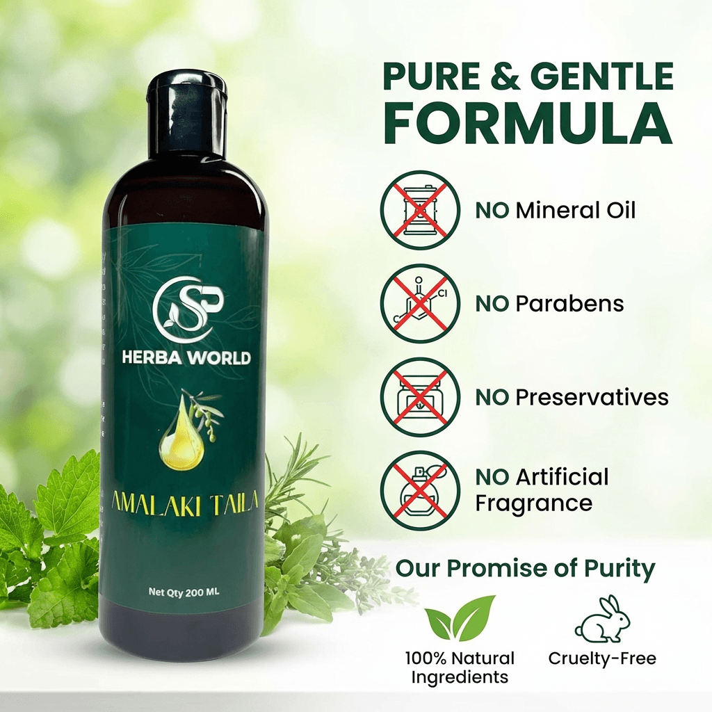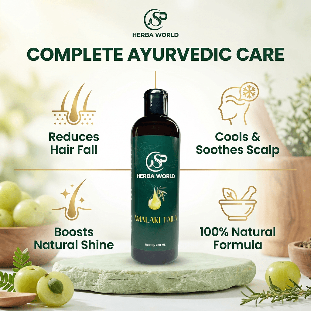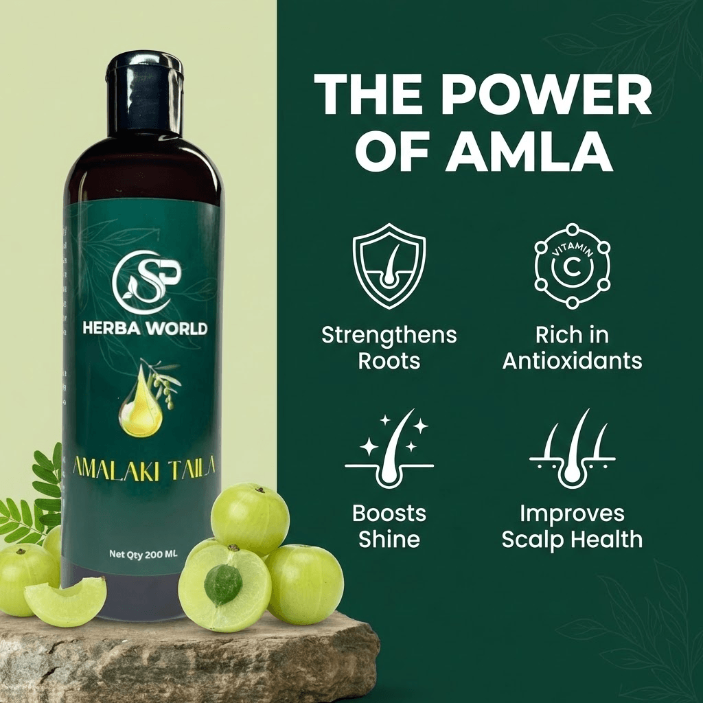 SP Herba World Amalaki Taila is a premium herbal oil crafted with Amalaki (Indian Gooseberry) infused in a nourishing sesame oil base. Designed for both scalp and body application, this traditional formulation supports healthy-looking hair and smooth, well-conditioned skin.