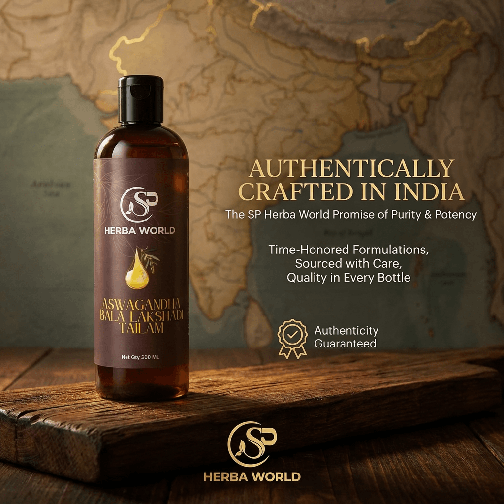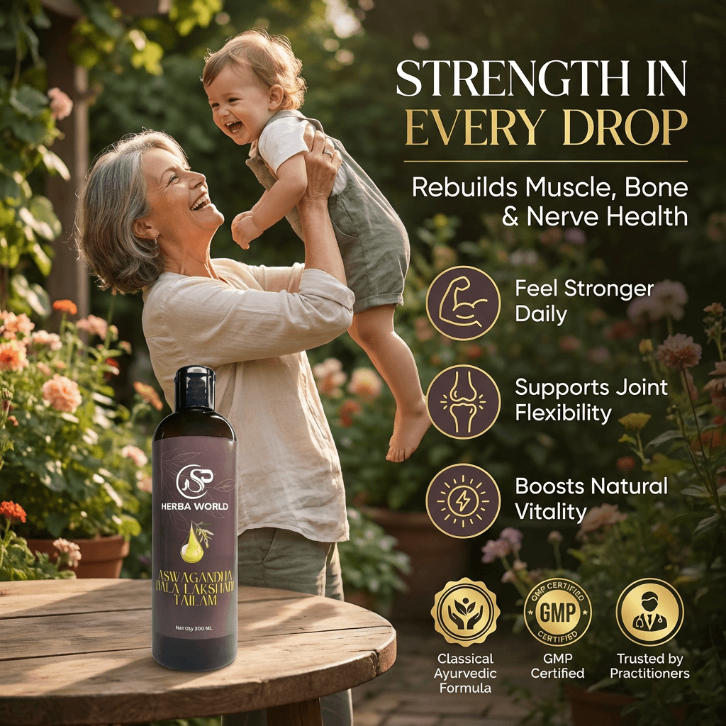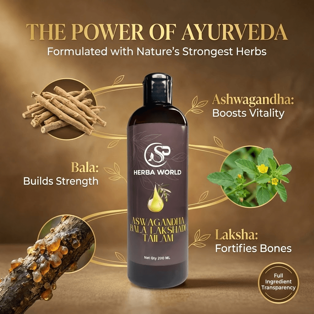 SP Herba World Aswagandha Bala Lakshadi Tailam 200mlAswagandha Bala Lakshadi Tailam – Herbal Body Massage Oil (200ml)