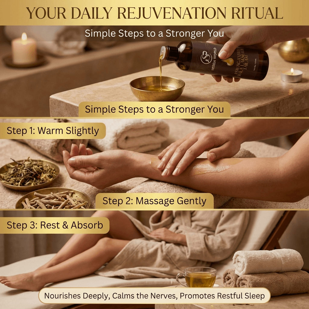 Take a sufficient amount of SP Herba World Aswagandha Bala Lakshadi Tailam and gently massage onto the body using circular or upward strokes. Leave on for 20–30 minutes before bath for best results.
