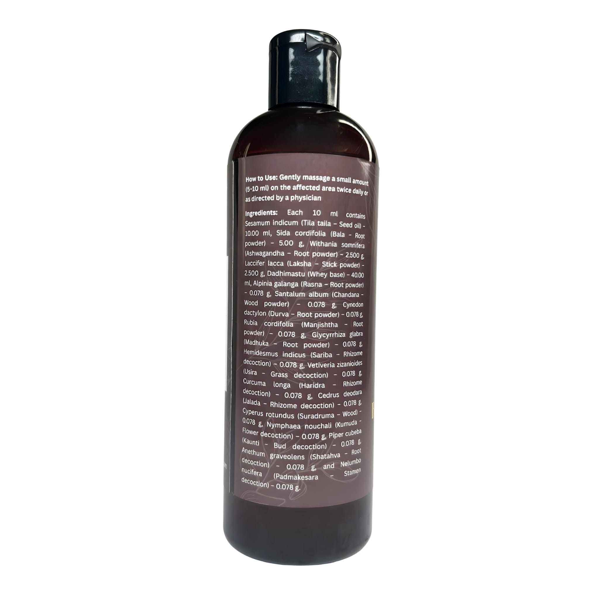• Sesame Oil (Tila Taila) – Deeply moisturizing base oil that supports smooth application and absorption.