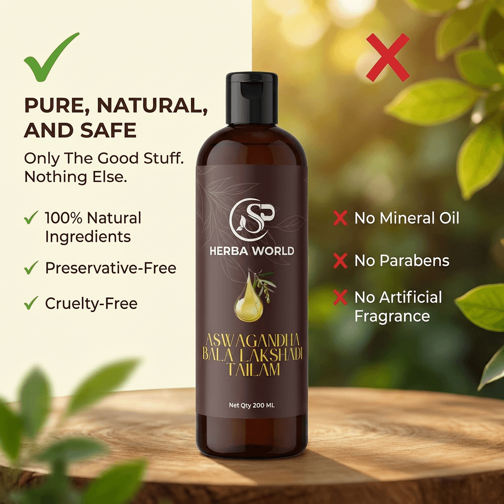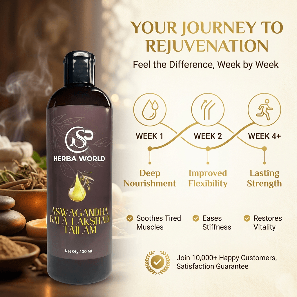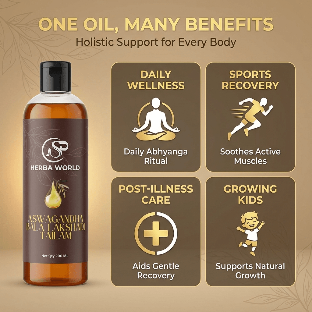 SP Herba World Aswagandha Bala Lakshadi Tailam is a premium herbal body oil crafted using traditional botanical ingredients blended in a nourishing sesame oil base. Designed for regular body massage, this rich oil supports skin nourishment, promotes flexibility, and enhances your daily self-care ritual.
